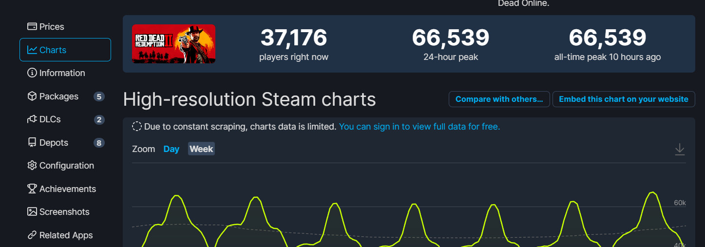 在这期间,《荒野大镖客2》Steam在线人数再创新高,10个小时前,《荒野大镖客2》同时在线达到了66539人。
