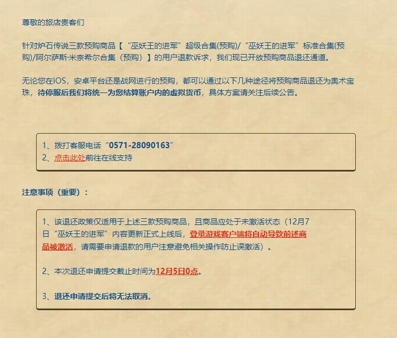 此前网易暴雪游戏客服团队还发布了《炉石传说》“巫妖王的进军”预购合集退款说明:无论是iOS、安卓还是战网,只要预购了“巫妖王的进军”超级合集、“巫妖王的进军”标准合集或阿尔萨斯·米奈希尔合集的用户,均可通过官方网站,或拨打客服电话提出退款申请。