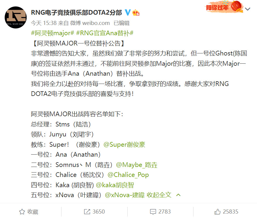 今天下午,RNG电子竞技俱乐部DOTA2分部发布公告,由于队内Carry Ghost(陈国康)美国签证没有通过,队伍决定依然会参加美国阿灵顿Major,Carry将由Ana替补出战。