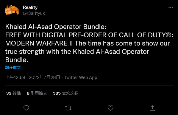 数据挖掘者声称该更新还包括与 Khaled Al-Asad 运营商捆绑包相关的文件,据报道该捆绑包称 Al-Asad 将“通过数字预购《使命召唤:现代战争 2》免费获得”。 Al-Asad 是原版《现代战争》中的反派角色,也是《现代战争 2019》发布后故事中的第二个反派角色,因此他可能会与即将发售的《现代战争 2》剧情联系在一起。