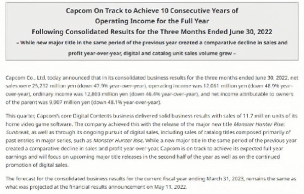 近日,卡普空公布了本财年第一季度的财务业绩(4月1日至6月30日)。根据公布的数据来看,第一季度的销售额为252.32亿日元,同比下降47.9%,其中数字内容业务的净销售额为198.6亿日元,同比下降了54.8%。