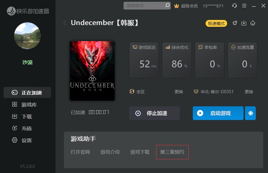 然后,在《加速器特权网》搜索“十三月/Undecember”,选择“Undecember”,进行加速。