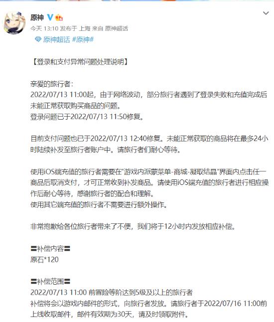 今日上午,《原神》出现游戏登录及内购系统问题,玩家纷纷表示“十连就无事发生。”中午时分《原神》官方发布登录和支付异常问题处理说明,称由于网络波动,部分玩家遇到登录失败和充值完成后未能正常获取购买商品的问题。目前,相关问题均已修复,未能正常获取的商品将在最多24小时陆续补发至账户中。此次补偿内容为120原石。