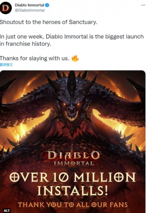 由暴雪与网易联合出品的《暗黑破坏神:不朽》近日已上线国际服,国服将于6月23日正式推出。近日官方发布推文,称短短一周内,该作已经完成了该系列最伟大的壮举。同时附上了一张显示游戏安装数破千万的图片。