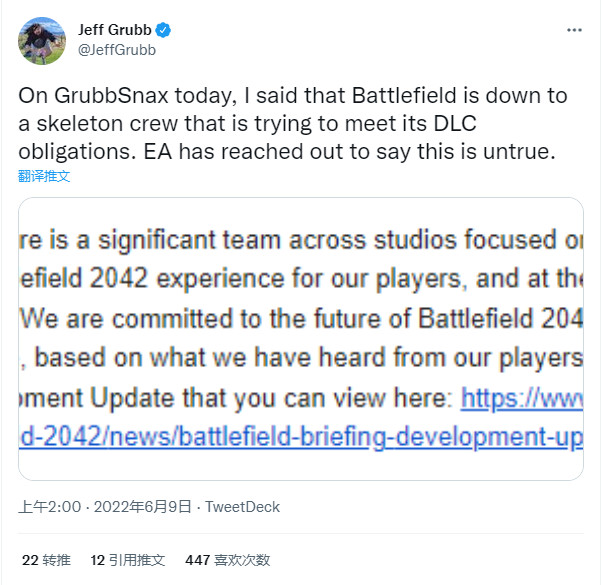 Grubb在他的付费播客节目Grubbsnax上说:“这个游戏基本上是最低数量的工作人员在负责。就像只剩下骨架了,这些人只是致力于承诺的额外赛季,即需要满足其销售的高端版本的需求。这些人正在尽可能地以最快和最便宜的方式产出。” 随后他解释说EA这么做的原因是新的《战地》正在预制作中。 “他们这么做是为了让每个人都能尽快地转移到新的《战地》游戏中,《战地》开发者真正的核心员工已经在开发新的《战地》了。” 消息曝光后,EA否认了Grubb的爆料。EA在声明中表示:“这不是真的。有一个跨越多个工作室的重要团队负责进化和改进《战地2042》的游戏体验,而核心就是我们的DICE团队。我们致力于《战地2042》的未来,你可以从最近的开发更新中阅读我们对《战地2042》的专注地方,这些都是根据我们从玩家中收到的反馈而来。”