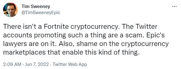 今日(6月7日),Epic Games 首席执行官Tim Sweeney发推表示:“没有堡垒之夜虚拟货币,目前宣传该事的推特账号都是诈骗,Epic法务部正在对接此事。还有虚拟货币市场应对纵容此事存在而感到羞耻。”