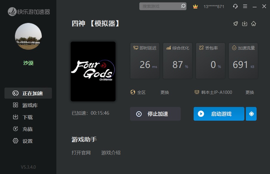 3、下载好打开客户端点击登录账号密码,点击“游戏库”,搜索“四神”进行加速;