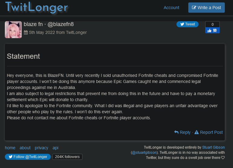 Epic Games 在澳大利亚将一名《堡垒之夜》作弊者告上法庭,最终结果是作弊者公开道歉,关闭了他出售被骗和被盗账户的业务,并向 Epic 支付损害赔偿金,该公司将捐赠给慈善机构。