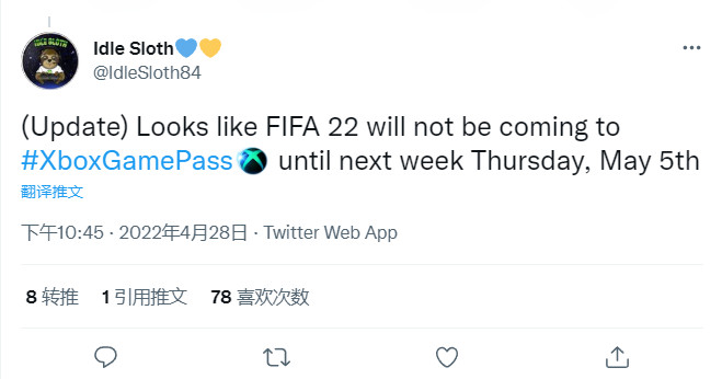 此外,Xbox新闻推主Idle Sloth也爆料称《FIFA 22》即将在下周四(5.5)登陆EA Play/Xbox Game Pass。