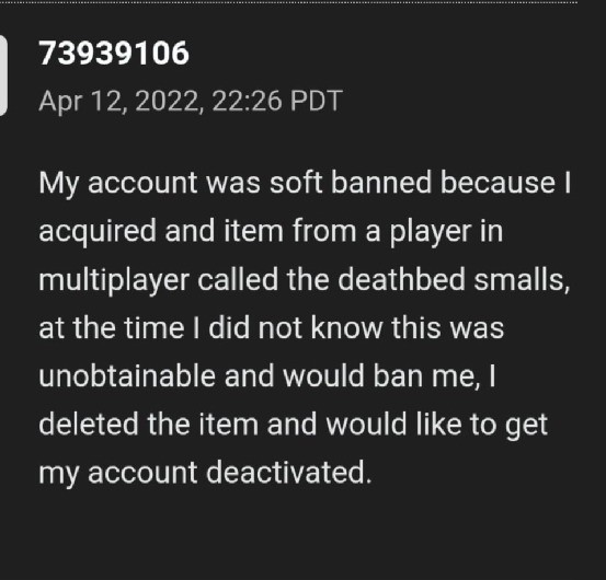 Reddit论坛用户Glass_Hydra发文称,由于自己涉世未深,看见有人丢下死眠长裤,他便毫无戒心捡了起来,结果被官方封号。之后他马上联系万代南梦宫官方进行处理,并依照指示删除了相关存档后重新安装,才避免了180天的封号惩罚。最后Glass_Hydra呼吁大家看到地上的内裤不要乱捡,并且还提醒各位,那位留下死眠长裤的玩家名为“内裤商人(Pantsu Dealer)”。