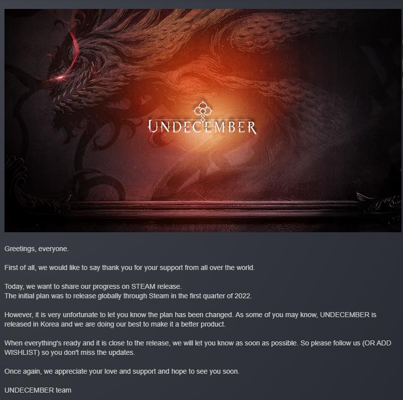 近日,游戏开发团队Needs Games宣布ARPG游戏《十三月(UNDECEMBER)》变更发行计划,或将延迟在Steam上发行,这款游戏已于 2022 年 1 月 13 日在韩国发行,PC端为韩国Floor平台运营,目前 Steam 上的发行日期,已从之前的“1Q 2022”更改为“2022”年。