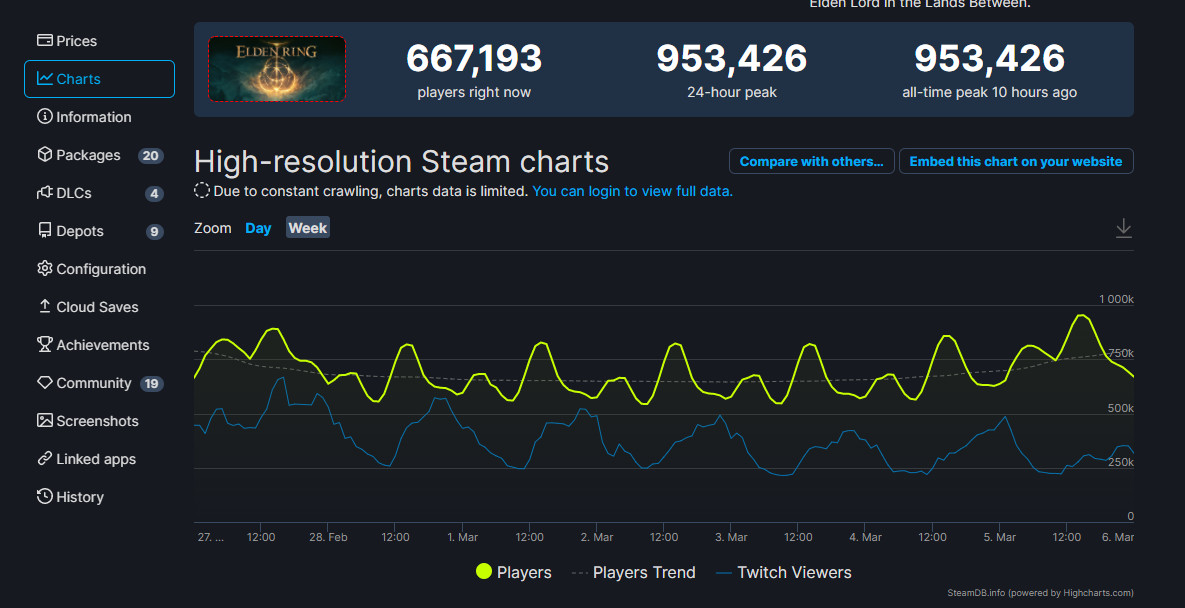 分析师Benji Sales表示,一般情况下大部分游戏在线峰值是在发售首周末,但《艾尔登法环》非常罕见地在发售第二周迎来了新的峰值。