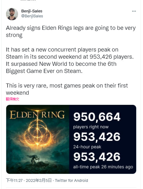 根据SteamDB,《艾尔登法环》Steam在线峰值再创新纪录,在发售的第二个周末同时在线玩家达到了95万3426人,击败了亚马逊的网游《新世界》(91万3634人),成为Steam上有史以来在线玩家最多的第六大游戏,同时也是Steam上在线人数最高的第二大单人游戏,仅次于《赛博朋克2077》,后者纪录保持在105万4388人。