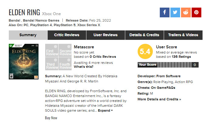 《艾尔登法环》Xbox One版MTC用户评分:5.4分