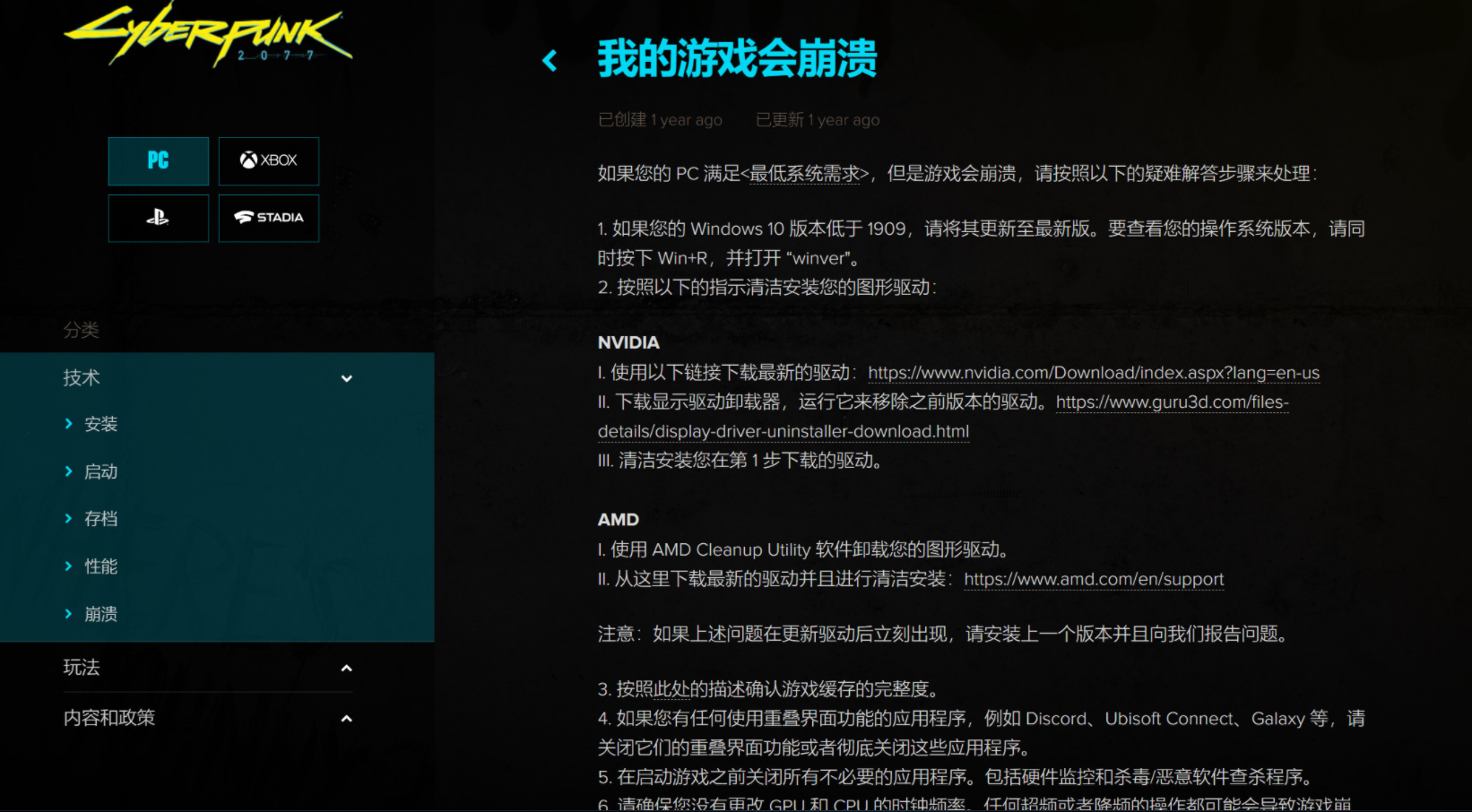 如果您的 PC 满足<;最低系统需求>,但是游戏会崩溃,请按照以下的疑难解答步骤来处理: 1. 如果您的 Windows 10 版本低于 1909,请将其更新至最新版。要查看您的操作系统版本,请同时按下 Win+R,并打开 “winver"。 2. 按照以下的指示清洁安装您的图形驱动: NVIDIA I. 使用以下链接下载最新的驱动:https://www.nvidia.com/Download/index.aspx?lang=en-us II. 下载显示驱动卸载器,运行它来移除之前版本的驱动。https://www.guru3d.com/files-details/display-driver-uninstaller-download.html III. 清洁安装您在第 1 步下载的驱动。 AMD I. 使用 AMD Cleanup Utility 软件卸载您的图形驱动。 II. 从这里下载最新的驱动并且进行清洁安装:https://www.amd.com/en/support 注意:如果上述问题在更新驱动后立刻出现,请安装上一个版本并且向我们报告问题。 3. 按照此处的描述确认游戏缓存的完整度。 4. 如果您有任何使用重叠界面功能的应用程序,例如 Discord、Ubisoft Connect、Galaxy 等,请关闭它们的重叠界面功能或者彻底关闭这些应用程序。 5. 在启动游戏之前关闭所有不必要的应用程序。包括硬件监控和杀毒/恶意软件查杀程序。 6. 请确保您没有更改 GPU 和 CPU 的时钟频率。任何超频或者降频的操作都可能会导致游戏崩溃,并且在无意中对您的硬件造成永久性损伤。
