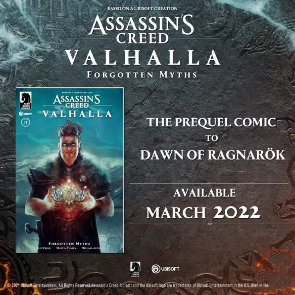 育碧将与黑马漫画(Dark Horse)合作,为旗下游戏《刺客信条:英灵殿》推出名为《被遗忘的神话》(Forgotten Myths)的漫画,将于2022年3月16日发布。该漫画为明年3月上线的DLC“末日曙光”(诸神黄昏的预兆、Dawn of Ragnarök)的前传,时间线也在DLC之前。