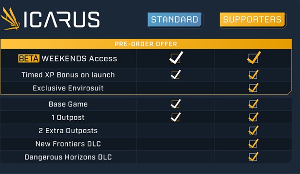 《翼星求生 ICARUS》标准版定价90元,12月7日前享受9折优惠,81元即可入手,包含了游戏本体、限时经验加成以及1张可以随意建造的前哨站地图。游戏粉丝典藏版定价278元,12月7日前享受9折优惠,250.2元即可入手,除了标准版的内容外,还包含了2个将在2022年发布的DLC《未知区域》和《前路凶险》,2张额外的前哨站地图,一套游戏内可使用的内置水槽环境服套装。游戏支持包括简体中文在内的共9种语言。