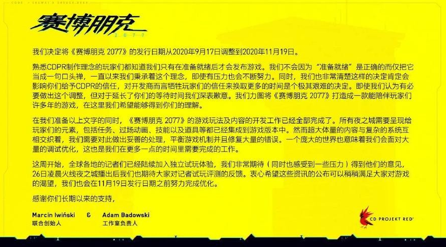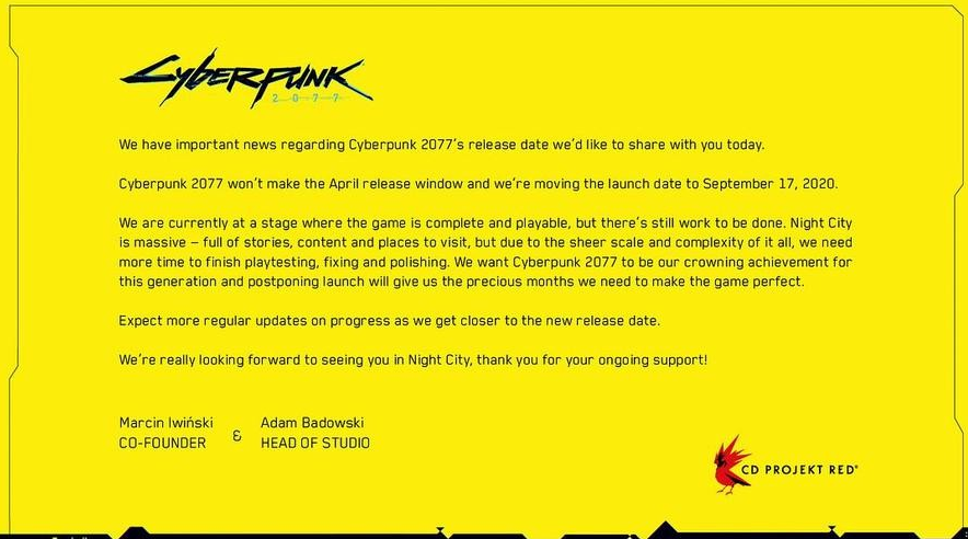 然而,之后的故事我们都知道了。《赛博朋克2077》可以说完美地演绎了“眼看他起朱楼,眼看他宴宾客,眼看他楼塌了”。从开放预售时公布游戏将在2020年4月16日发售开始,CDPR为我们演绎了一出名为“跳票”的闹剧。 跳票之路 道阻且长 2020年1月17日,在距离之前公布的游戏发售日三个月之时,CDPR为广大玩家准备了一份“惊喜”——宣布《赛博朋克2077》跳票至2020年9月17日,跳票的理由是“需要善后和打磨”。