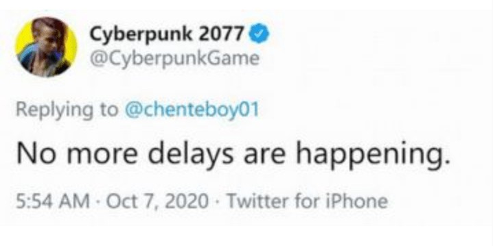 也许是出于《巫师3》和此前《赛博朋克2077》宣传片的出色素质,彼时的玩家还是比较宽容的,虽然也有小部分声音表达了对于跳票的不满,但大部分玩家还是表示可以理解的。毕竟,要做出一个如此体量的开放世界3A游戏,确实是需要大量时间的。甚至有些玩家在当时把这次跳票当作是CDPR“专注游戏质量,对玩家负责”的正面例子。 不幸的是,玩家们还是太年轻了。2020年6月19日,距离跳票后的发售日期不足三个月,CDPR又为玩家们准备了一份“大礼”——宣布《赛博朋克2077》再次跳票至11月19日。