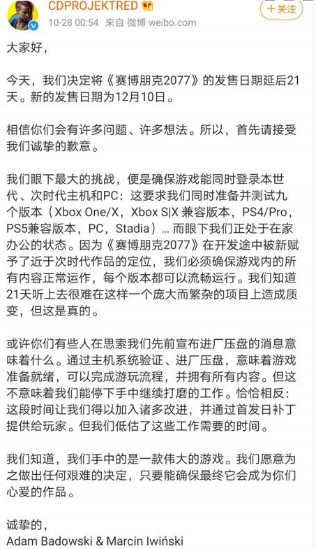 不得不说,CDPR在跳票上确实有两把刷子,这次他们换了个理由:“游戏能玩了,但我们需要平衡机制和修复错误”。 第二次跳票,使得玩家对《赛博朋克2077》的态度产生了分化,一部分玩家依然在对游戏内容和质量的信心驱动下保持着相对宽容的态度,但另一部分玩家则开始对这种反复无常的举动表示不满。 对于笔者而言,大概也是从这次跳票开始,对《赛博朋克2077》降低了预期。 可能跳票这种事情就和白嫖一样会上瘾,在之后的10月5日宣布进厂压盘;10月7日明示不再跳票之后,2020年10月28日,CDPR再次宣布游戏跳票至12月10日发售。这次官方给出的理由是:“需要同时准备并测试九个版本并且只能在家办公”。