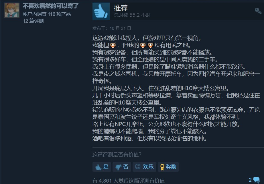 毁誉参半 难如人意 于是,就在这样一种微妙的状态下,2020年12月10日,《赛博朋克2077》姗姗来迟。那么,让无数玩家在一次又一次的跳票中苦苦等待了大半年的它,素质究竟如何呢?也许Steam评测中最高亮的那条能给你答案: