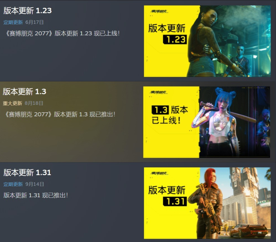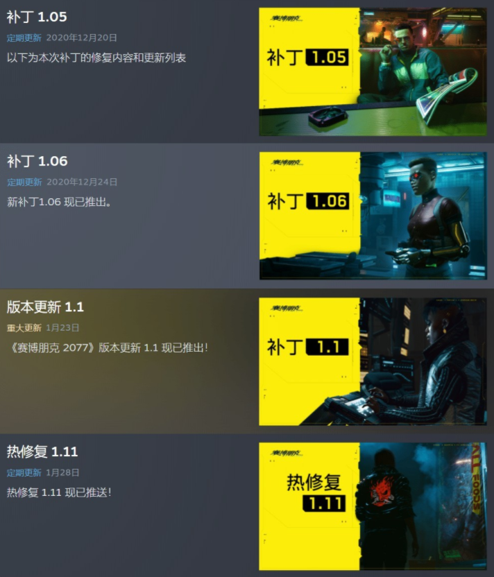 亡羊补牢 为时未晚 在“赶鸭子上架”式发售之后,《赛博朋克2077》就开始修复BUG的工作。从发售当日的首日补丁开始,CDPR发布了从V1.04到V1.31总计12个大大小小的补丁,这些补丁除了加入少量服装和外观之外,几乎都在致力于调整游戏平衡和修复BUG。时至如今,虽然仍然存在一些BUG,但相比游戏发售初期那种一小时就要碰到几次的程度,已经有了长足的进步。