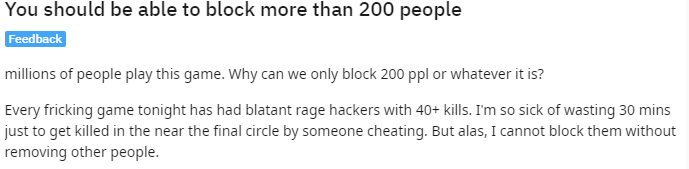 但在游戏中还存在其他问题,让玩家觉得苦恼。在《使命召唤:战区》中你可以选择屏蔽你认为疑似作弊者的玩家,以防止在以后的比赛中匹配到他,但由于过于猖獗的外挂玩家导致很多正常玩家的屏蔽名单已经被填满,200个黑名单名额显然并不足以屏蔽每一个遇到的外挂玩家。而在此情况下,玩家只能选择从列表中移出一名作弊者或是不屏蔽这个新的作弊者。 显然这不是玩家想要做出的选择,也许比输给外挂玩家更糟糕的事是在重新匹配时再次遇到同一名外挂玩家。而将原有名单中的作弊者移出也不是最佳选择,我们没办法知道这些作弊者是否已被封禁,是否会再次匹配到他们。有许多玩家在Reddit上发表看法,向动视表达了对这种处理方式的不满。