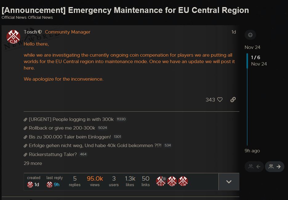 在官方赠送出黄金后的几个小时后,整个服务器被下线,并进行了漫长的维护,最终,亚马逊宣布了服务器整体回档。开发团队表示,该补偿最初是针对那些因游戏内税收而失去金币的玩家。