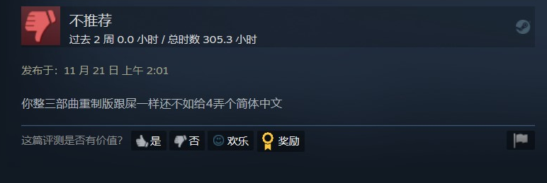 《自由城》的独特氛围和备受好评的剧情是其的一大亮点,让其成为不少玩家心中的神作,不过R星一直不出中文,很让国内的玩家抱怨,还真有国内网友在体验过《GTA:三部曲》后,在steam上的《GTA4》下评论表示:“三部曲重制版跟屎一样还不如给4弄个简体中文”。