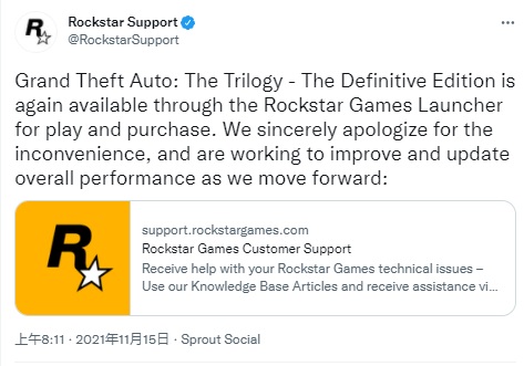 今日,R星在官方推特宣布《GTA三部曲:终极版》已经完成更新,现已重新上架R星游戏启动器,玩家可以继续购买和游玩该游戏的PC版,并对给玩家造成的不便道歉。R星还表示今后会继续对游戏进行更新和改进,以求得更好的游戏表现。