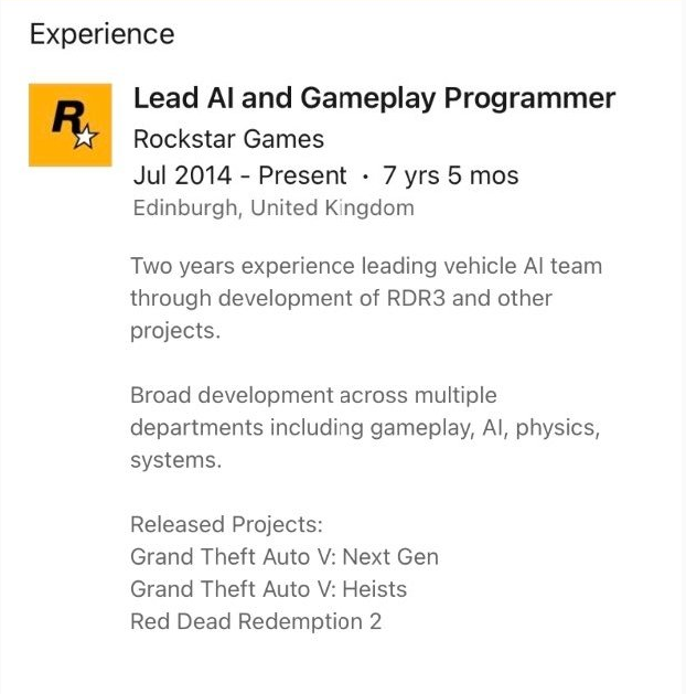 在一位曾在R星任职的人员领英页面显示,他在“RDR3以及其他游戏中拥有2年领导开发载具AI的经验”。这里的RDR3明显就是《荒野大镖客3》的缩写,如果简历并非拼写错误,那么可以说明《荒野大镖客3》的开发工作是在《荒野大镖客2》发行后不久开始的。