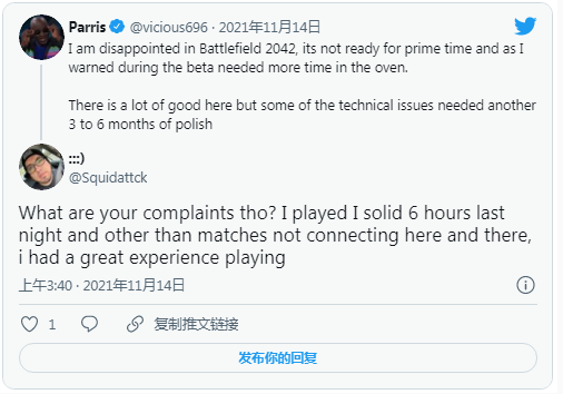 Gamertag Radio的联合主持人之一Parris在推特上表示,他对《战地2042》感到很失望,认为“它还未准备好”。正如他在前几次测试版中说的,《战地2042》需要更多的开发时间。对于他的评价,帖子下方的回复也相当两极分化,喜欢游戏的和同意他观点的都有,但游戏在M站3.2的玩家评分显然表明不喜欢的玩家占了更多数。