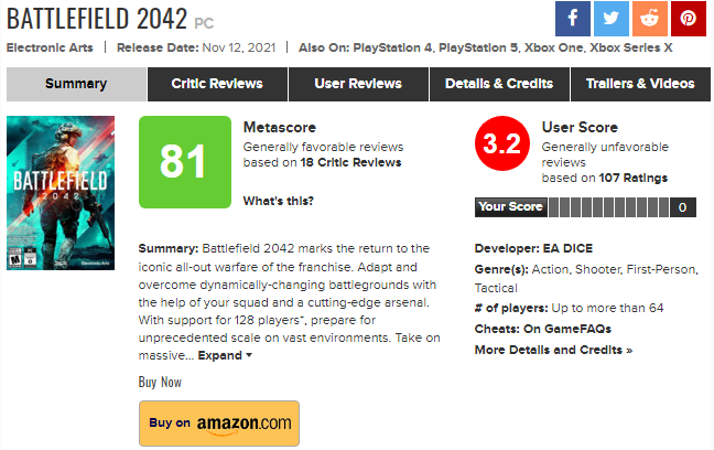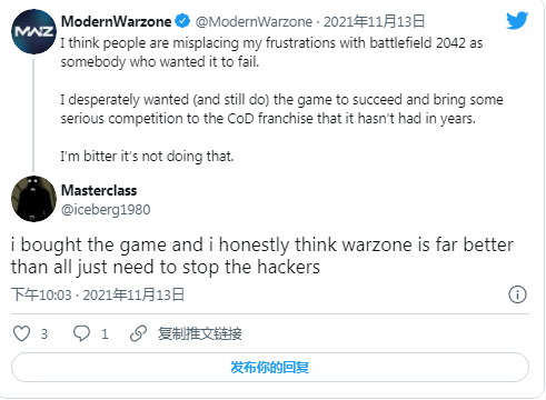 ModernWarzone是一个主要报道《使命召唤》新闻的账户,他们也公开表示对《战地2042》感到很失望,他们希望《战地2042》能够表现出色,为《使命召唤:先锋》提供一些激烈的竞争,但很遗憾这并没有发生。