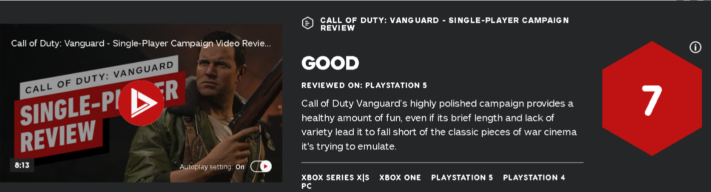 11月5日,IGN为《使命召唤:先锋》单人战役进行了评测,并给出7分好评。IGN评测者认为,《使命召唤:先锋》战役提供了大量的游玩乐趣,但其长度较短且缺乏多样性,《使命召唤:先锋》将于11月5日正式发售,登陆PS5、PS4、Xbox Series X/S、Xbox One和PC。