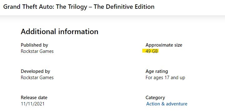 上周五Rockstar正式确定了《GTA:三部曲-终极版》的发售日期。近日,这款包含了三款经典GTA系列作品的合集又陆续上架各大平台的数字商城,通过微软商城和任天堂eShop,我们得知了游戏容量的细节。