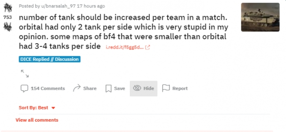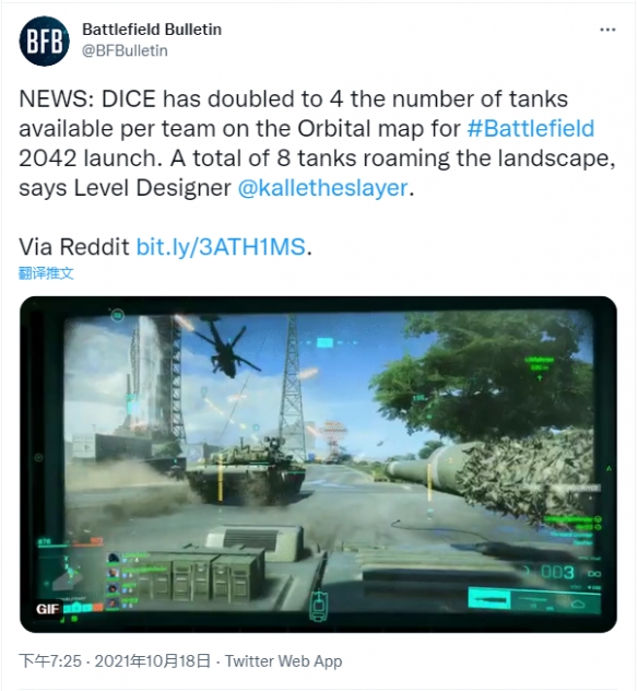 《战地 2042》的关卡设计师Kalle Nyström通过战地公告回复:“我同意,这就是为什么在发售时他们会翻倍到每队4辆,总共将有8辆坦克在大地上漫游!”