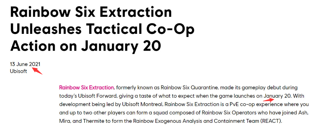 日前,据外媒报道,育碧官网可能泄露了《彩虹六号:异种》的准确发售日。据了解,在育碧官网一篇发布于今年6月份的文章显示,战术合作游戏《彩虹六号:异种》将于2022年1月20日发售。此前育碧并未正式公布准确发售日,仅表示将于2022年1月发售。