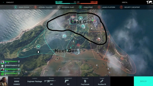 有国外的玩家在这几天的B测中发现,PS4和XboxOne的上世代版《战地2042》多人对战时的地图要比次世代版本小很多,对比图如下,图中黑色线条画出的区域与整个区域相比,大改仅有四分之一左右。标记了“NextGen”的次世代新增区域面积更大,包含有雷达站等设施,而且森林覆盖面更多。