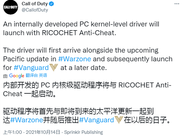 昨天,动视警告说《使命召唤》的外挂即将迎来坏消息。今天,随着Ricochet的发布,它兑现了这一承诺,这是一种新的反作弊技术,采用内核级驱动程序来“帮助识别作弊者,加强和加强整体服务器安全性”。 Ricochet Anti-Cheat安全功能将与《使命召唤:战区(Call of Duty: Warzone)》的太平洋更新一起推出。随后加入《使命召唤:先锋(Call of Duty: Vanguard)》中。