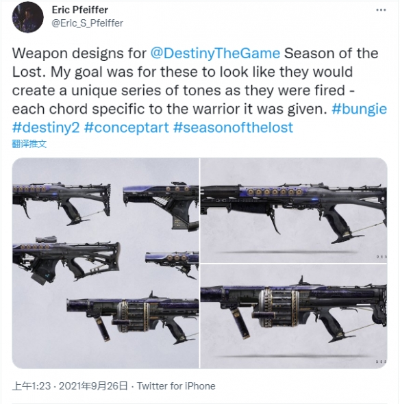 Pfeiffer 谈到艺术时说,他的目标是让武器看起来好像“在发射时会产生一系列独特的音调”。他还表示,他曾设想过每件武器都会根据赋予它的战士发出独特的声音。一位粉丝将这个概念与《命运 2》的故事本身联系起来。
