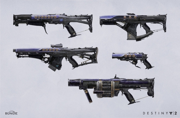 概念艺术与《命运 2》玩家最终在游戏中得到的非常相似。许多玩家能够立即识别出自动步枪 Chrysura Melo 以及榴弹发射器 Canis Major。Pfeiffer 本人似乎表达了对霰弹枪 Fractethyst 的热爱,因为他自己贴出了这把武器。