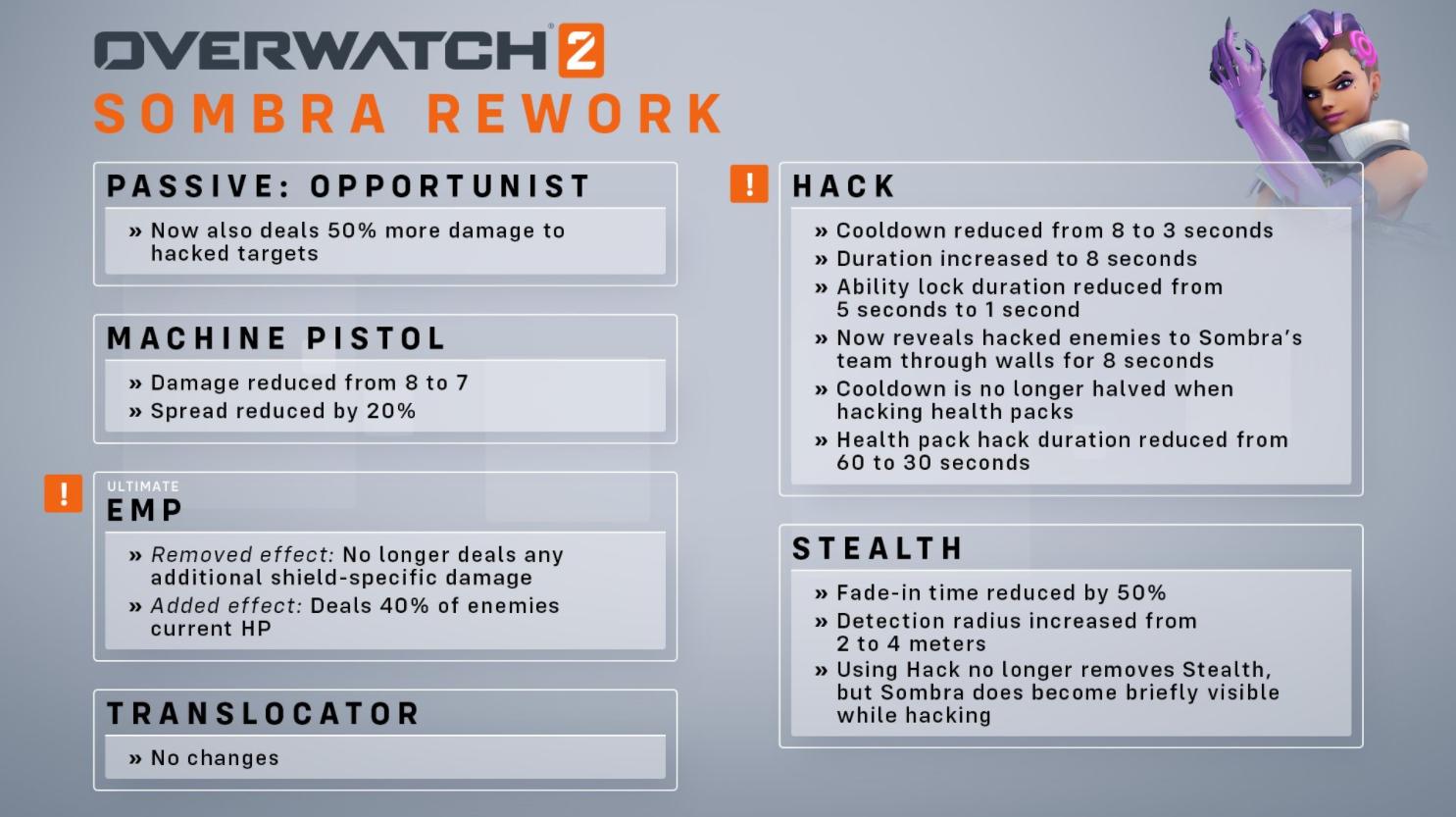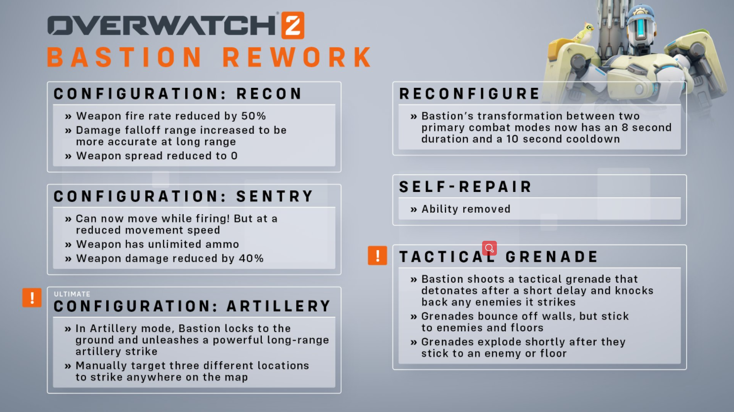 外观改动 “自我修复”技能移除同时获得新的辅助攻击技能 “侦查模式”下子弹不再扩散但射速减慢 不再进入“坦克模式”取而代之为全新的“火炮模式” 在“哨兵模式”下将可移动攻击
