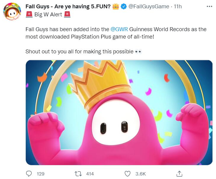 欢乐向多人游戏《糖豆人:终极淘汰赛》在2020年风靡一时,首发时还曾加入PS4会免阵容,下载此处非常多。近日《糖豆人》官方表示,他们已获得“吉尼斯世界纪录”认证,是史上“PS会免下载量最高的游戏”。