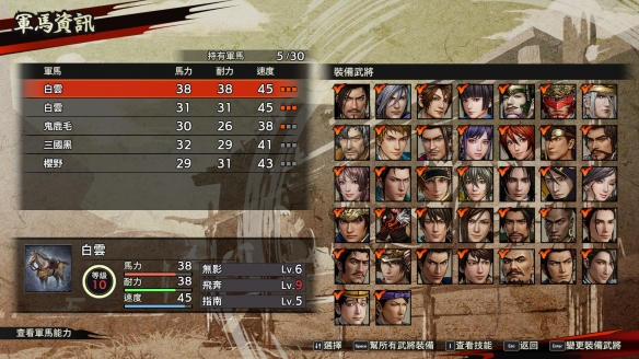 这匹马Lv10能力为马力49、耐久49、速度48,技能为再起Lv9、顽强Lv9(马的耐久不会下降)、无影Lv9(骑马奔跑时不会因为受伤落马)。