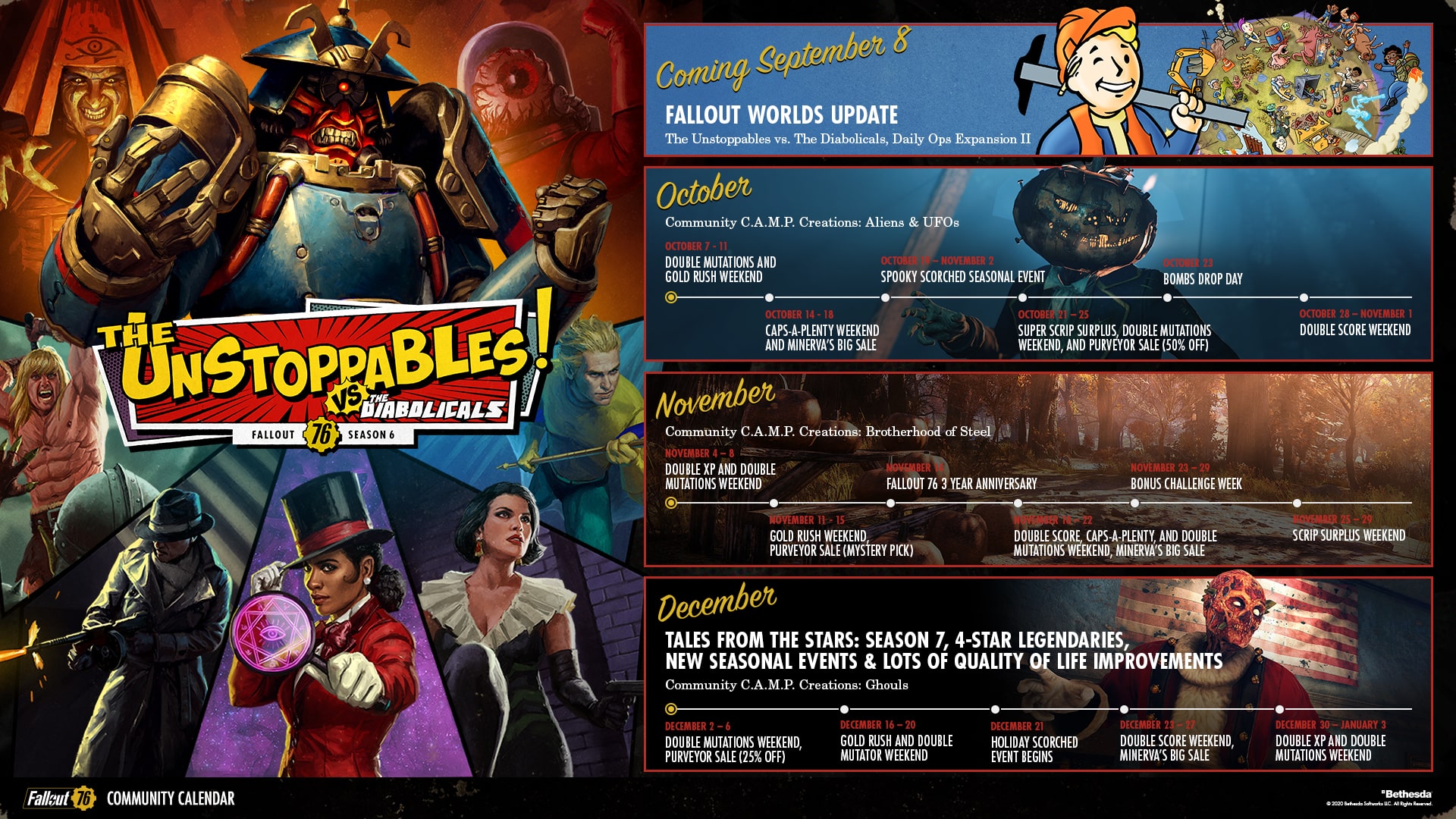 近日,B社宣布《辐射76》第六赛季更新将于9月8日正式发布,第6赛季的主题为“无人能挡大战恶魔(THE UNSTOPPABLES VS THE DIABOLICALS)”。第6赛季将会有众多的奖励在记分板上等待玩家去解锁,其中包括新的服饰、武器涂装、动力装甲涂装。