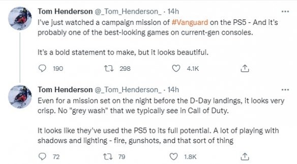 Henderson声称在PS5上观看了一个战役任务——似乎是发生在诺曼底登陆的夜晚,他表示“这可能是当代主机上最好看的游戏之一。虽然听上去可能有些夸张大胆,但的确名副其实。”“即便是在诺曼底登陆前一晚执行任务,它看起来也很清爽,没有我们在《COD》中经常看到的“灰色(grey wash)”。看来他们已经把PS5的潜力完全发挥出来了。添加了很多阴影、灯光、战火、枪声之类的东西。”