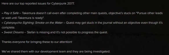 CDPR刚刚更新了《赛博朋克2077》中需要解决的几个问题,这些问题是玩家备受关注的问题,也是官方正努力攻克的几个问题。