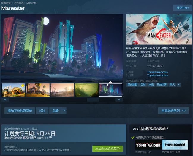 《食人鲨》(Maneater)已于2020年5月在Epic商城推出。现在《食人鲨》登陆Steam平台,游戏将于2021年5月25日发售,支持中文。喜欢的小伙伴可以加入《加速器特权网》体验哦!