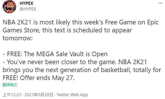 上周,Epic商城提供了叙事游戏《狮子之歌》,并表示会在本周带来一款免费的神秘游戏。今天(5月20日),有擅长数据挖掘的国外用户透露,此次Epic为玩家带来的免费游戏是《NBA 2K21》,以上消息来自经常对《堡垒之夜》进行数据挖掘的推特用户HypeX。根据他的发现,Epic方面已经提前准备好了公布《NBA 2K21》免费的文本,特别注明免费时间到5月27日截止。《加速器特权网》已经完美支持该游戏,喜欢的小伙伴届时记得使用《加速器特权网》进行加速领取哦!