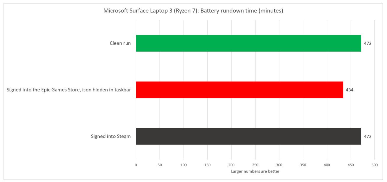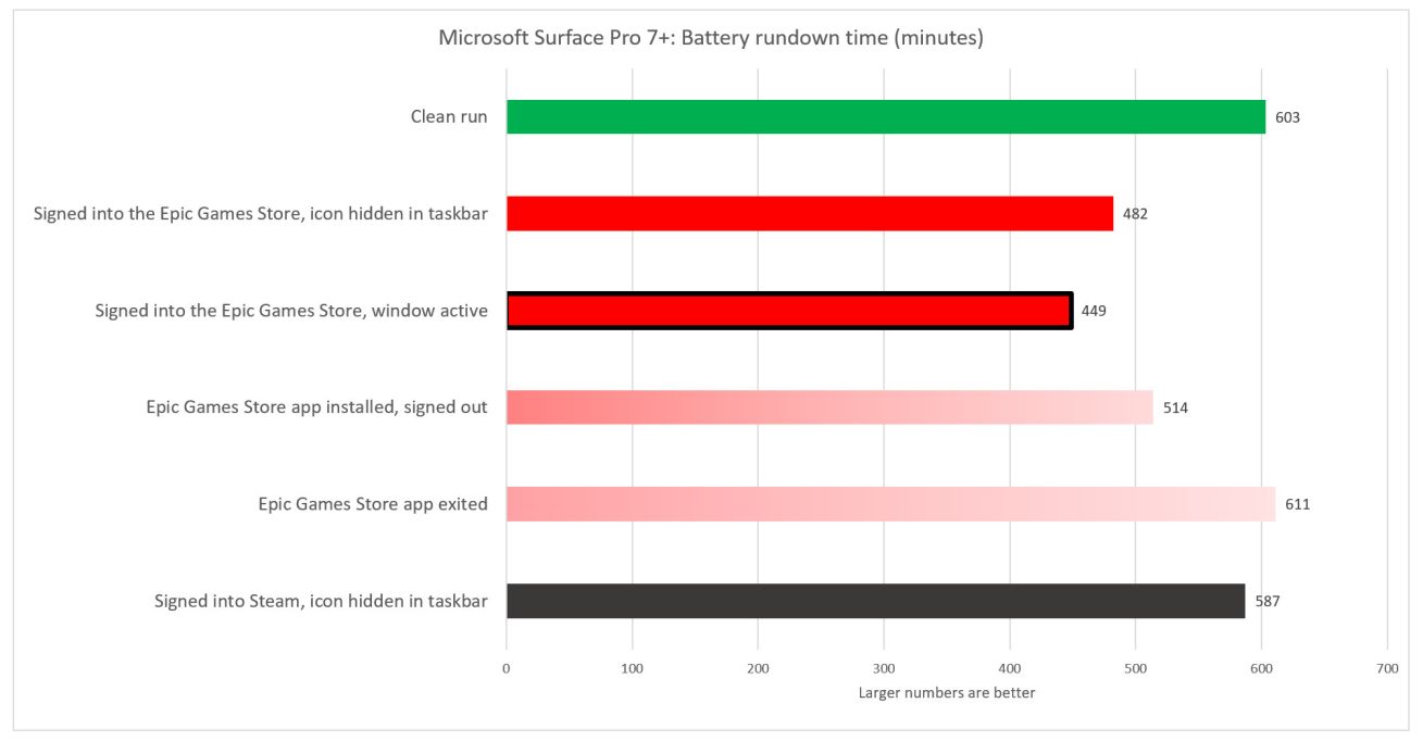 该报道来自PCW's testing,他们在2个不同PC系统上开启飞行模式,并测试对比了打开、关闭Epic平台,登陆、不登陆Epic平台等情况,结果发现:Epic平台会让微软Surface Pro 7+电池使用时长下降20%(约2小时),会让Surface笔记本3电池使用时长下降8%。